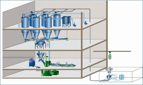目前國內的自動混合及輸送配料系統主要由輸送設備、投料站(或者補料倉)、喂料機、稱重料斗、混合機、控制系統組成: